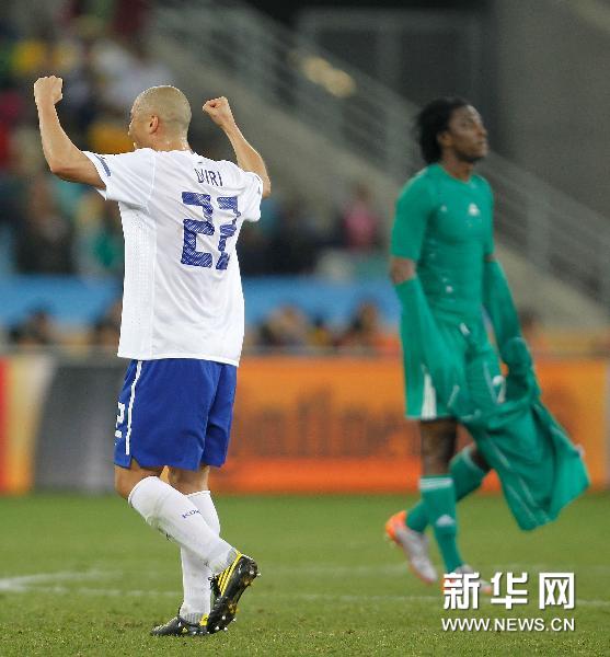 6月22日,韓國(guó)隊(duì)球員車杜里(左)與尼日利亞隊(duì)球員狄克遜·埃圖胡在比賽后。當(dāng)日,在德班舉行的2010南非世界杯足球賽B組最后一輪比賽中,韓國(guó)隊(duì)以2比2戰(zhàn)平尼日利亞隊(duì),從而以三戰(zhàn)一勝一平一負(fù)最終積4分成功晉級(jí)16強(qiáng)。尼日利亞隊(duì)則以三戰(zhàn)一平兩負(fù)最終積1分無緣十六強(qiáng)。新華社記者廖宇杰攝