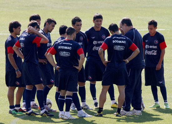 中廣網(wǎng)北京6月25日消息 南非當(dāng)?shù)貢r(shí)間6月23日,智利國家隊(duì)在內(nèi)爾斯普雷特一體育場內(nèi)進(jìn)行備戰(zhàn)訓(xùn)練。25日,他們會(huì)迎來小組賽的下一個(gè)對(duì)手西班牙隊(duì)。上圖為主帥貝爾薩講解技戰(zhàn)術(shù)。
