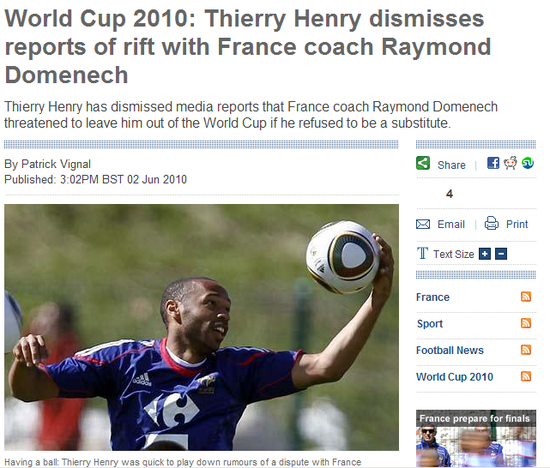 之前曾有一家地方性的媒體在報(bào)道中說(shuō)亨利不甘于在世界杯上坐冷板凳,而法國(guó)主帥多梅內(nèi)克回應(yīng)說(shuō),如果亨利不接受做替補(bǔ)的安排就不帶他去南非。對(duì)此,亨利聲明這完全是無(wú)稽之談:“我并沒(méi)見(jiàn)過(guò)這些奇怪的報(bào)道,也不知道它們是從哪冒出來(lái)的。事實(shí)上教練只跟我說(shuō)過(guò)我將不會(huì)在世界杯上首發(fā)出場(chǎng),我當(dāng)時(shí)坦然的接受了。”