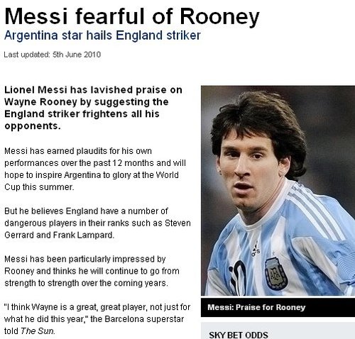 在被問及英格蘭的球員誰最優(yōu)秀時,梅西毫不猶豫就說出了魯尼的名字。他說:“當然是魯尼,他是一個非常非常優(yōu)秀的球員。眾所周知,魯尼在本賽季的表現(xiàn)棒極了,但事實上,之前的每一個賽季他都送出了值得驕傲的答卷。他是這一代球員的代表,而且每年都在進步,越來越強。”