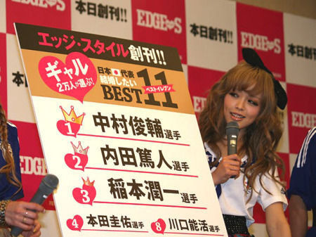 “最想結(jié)婚的日本球員11人”是通過印刷問卷在2萬名女性中進(jìn)行的調(diào)查,對象除了本屆世界杯的日本隊(duì)成員外,其他的日本球員也包括。之前的亞洲一哥--中田英壽以及連續(xù)兩場熱身賽擔(dān)任隊(duì)長的長谷部誠的落選稍顯意外。