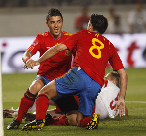 圖為西班牙隊(duì)比利亞和哈維在進(jìn)球后相擁慶祝。