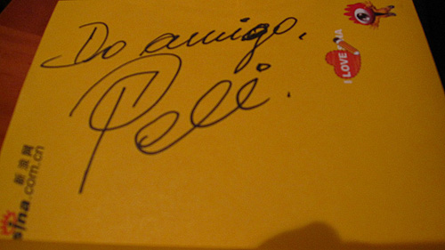在得知記者來(lái)自中國(guó)后,貝利說(shuō):“很遺憾中國(guó)隊(duì)不在這里。”我馬上補(bǔ)充道,“的確,06年也不在德國(guó),但您對(duì)中國(guó)足球關(guān)注的多嗎?” 我問(wèn)道。貝利微微一笑,說(shuō):“我對(duì)所有的球隊(duì)都關(guān)注,當(dāng)然,中國(guó)隊(duì)的情況我知道的不多。最近有一場(chǎng)比賽中國(guó)隊(duì)似乎戰(zhàn)勝了法國(guó)隊(duì)?”