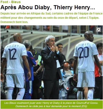 自從北京時(shí)間6月7日來到南非,法國(guó)國(guó)家隊(duì)的隊(duì)員們一直在主帥多梅內(nèi)克的指導(dǎo)下井然有序的訓(xùn)練著。但面對(duì)熱身賽幾度失利的境況和每況愈下支持率,法國(guó)隊(duì)的高層們不得不考慮是否該應(yīng)民心地改變下首發(fā)陣容,然而一項(xiàng)固執(zhí)己見的主帥多梅內(nèi)克似乎并沒有這個(gè)意思。
