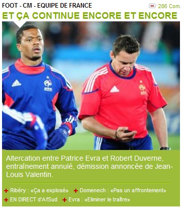 今天法國隊(duì)的訓(xùn)練是一次公開訓(xùn)練,結(jié)果剛開始不會隊(duì)長埃夫拉就在場地中央和體能教練羅伯特-杜維尼激烈爭執(zhí),在主教練多梅內(nèi)克的勸解下才將兩人分開,結(jié)果杜維尼憤怒的丟下秒表后離開。爭吵事件發(fā)生后,法國隊(duì)隊(duì)員隨即走回球隊(duì)大巴選擇罷訓(xùn)。