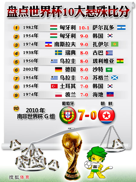 中廣網(wǎng)北京6月22日消息 北京時間6月21日,2010年南非世界杯G組將進(jìn)入第二輪爭奪。在開普敦綠點球場,葡萄牙隊與朝鮮隊交鋒。經(jīng)過90分鐘鏖戰(zhàn),葡萄牙7-0狂勝朝鮮隊,取得本屆世界杯開賽以來最大比分勝利。但這并不是世界杯上比分最懸殊的比賽,以上就是歷屆世界杯比賽分?jǐn)?shù)比較懸殊的盤點。
