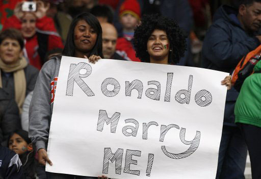 在這些瘋狂的女球迷中,有一位美女直接展示牌子:“羅納爾多,我也有很棒的控‘球’技術(shù)”,其一語雙關(guān)展示了拉丁美女的激情,而另位一位則更為直接:“羅納爾多,娶我吧!