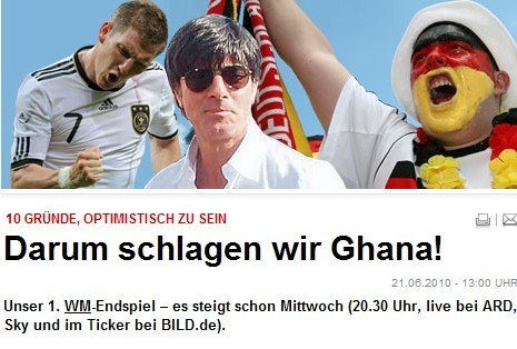 中廣網(wǎng)北京6月22日消息 北京時(shí)間6月22日,距德國(guó)與加納的最后一輪生死戰(zhàn)的開始越來越近了,德國(guó)媒體《圖片報(bào)》日前總結(jié)出了10條德國(guó)擊敗加納的另類理由:
