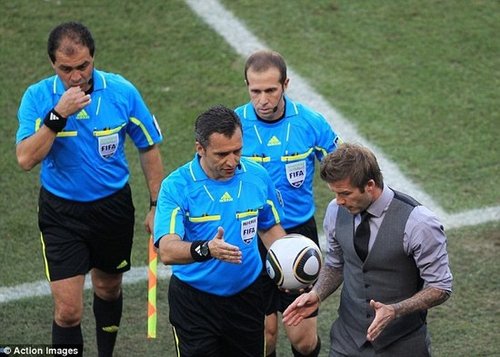 中場結(jié)束時,貝克漢姆一直等在球員通道,和每位下場的隊友擊掌,看到垂頭喪氣走下來的蘭帕德,貝克漢姆更是主動上前,重重的拍了拍隊友的肩膀?吹疆攬鲋鞑脺蕚渥呦聢,一向溫和的貝克漢姆一路追著裁判,嘴中不停的和主裁爭論著上半場對英格蘭隊進球的誤判。盡管萬人迷一臉焦急,然而身旁的主裁卻面無表情,絲毫不理會貝克漢姆的辯解。
