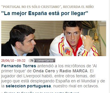 托雷斯最后談到了本屆世界杯西班牙隊的前景和球隊目前取得的進步,他表示:“在首場比賽敗給瑞士隊之后,我們改變了戰(zhàn)術思想,認真的做了總結(jié)。從某種意義來說,我們的改變是正確的,我們放下了包袱贏得了接下來的比賽。對戰(zhàn)葡萄牙的比賽,對我們來說這是第三場淘汰賽,第一場是洪都拉斯,第二場是智利,第三場是葡萄牙,我們要像戰(zhàn)勝洪都拉斯和智利那樣贏下去,因為我們在重壓力之下贏得了那兩場比賽,至少在迎戰(zhàn)葡萄牙的比賽中,我們要繼續(xù)打出我們的實力,繼續(xù)留在南非!
