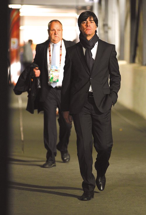 接下來,我說勒夫也很酷。2006年在克林斯曼身邊時玩的是白襯衣加西褲,今年玩的是黑西裝加圍巾,女人不服老不行,男人不洗澡不行,勒夫,不用跑也很有型。英德大戰(zhàn)中的一個小鏡頭,勒夫、比爾霍夫、弗里克三位教頭齊齊把一只腳踏在板凳上的一幕,不是一般的有型;旧希鞲蹦R,就可以進攝影棚拍《無間道四》。