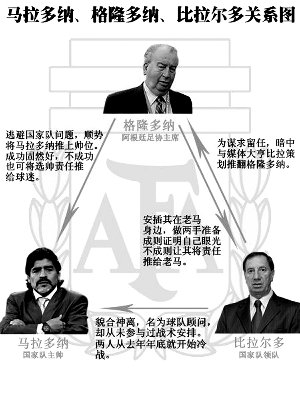 而比拉爾多和格隆多納之間的關(guān)系也非常復(fù)雜,去年10月,也就是阿根廷艱難出線后,馬拉多納曾表示:“這里有一場反對格隆多納的運(yùn)動。比拉(阿根廷傳媒大亨)和比拉爾多想把格隆多納趕走,而在與媒體的關(guān)系問題上,他們又輸給了我,所以他們就抓住我不放,制造各種消息來破壞我的名聲。這就是之前發(fā)生的一切!卑凑振R拉多納的意思,比拉爾多攻擊老馬,實(shí)則是在表達(dá)對格隆多納的不滿,因?yàn)檎呛笳卟抛尷像R坐上阿根廷主帥的位置。