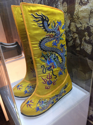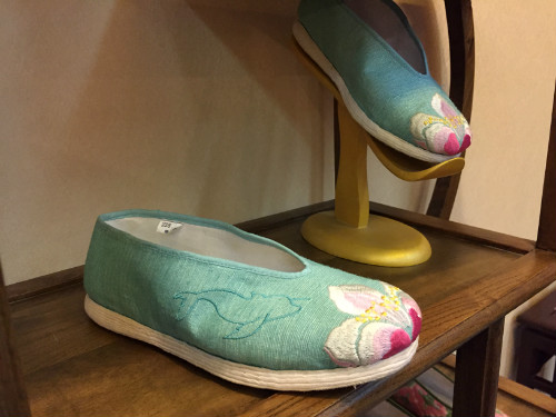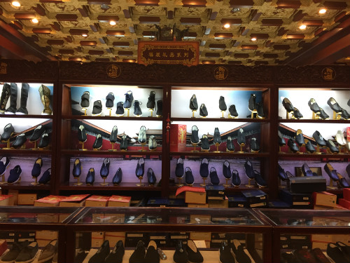 進(jìn)入店門,左手邊有一個(gè)工藝鞋展柜,都是些縮小了尺寸的鞋子,其中還有三寸金蓮鞋,這倒是按照原尺寸做的,只是作為藝術(shù)品,它還有些存在的價(jià)值。