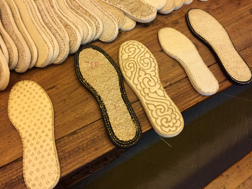 在內(nèi)聯(lián)升,納制布鞋鞋底,每平方寸要納九九八十一針;一雙普通千層底布鞋,要納制2100多針;制作一雙完整的布鞋,需要經(jīng)過90余道工序;整個(gè)制鞋過程涉及使用的工具達(dá)近40種之多。不同于一般流水線所生產(chǎn)出來的商品,內(nèi)聯(lián)升的鞋底,有著匠人們雙手摩挲的溫度,以及定制概念下,無法復(fù)刻的私人屬性。由于其制作工藝嚴(yán)格,工藝獨(dú)特,選料考究,做工精細(xì),技藝高深,難度大,耗時(shí)長,學(xué)徒需要三年零一節(jié)才能出師,如今學(xué)習(xí)此項(xiàng)技藝的人已經(jīng)是越來越少,內(nèi)聯(lián)升手工制鞋工藝已被列入《國家級非物質(zhì)文化遺產(chǎn)名錄》。內(nèi)聯(lián)升的千層底布鞋制作工藝?yán)^承了傳統(tǒng)民間的工藝,精選純棉、純麻、純毛禮服呢等天然材料,并在此基礎(chǔ)上進(jìn)行了自己的發(fā)展與創(chuàng)新,是名副其實(shí)的“工精料實(shí)”。主要特點(diǎn)可以歸納為“一高四多”,即:工藝要求高;制作工序多、納底的花樣多、绱鞋的绱法多、樣式多。