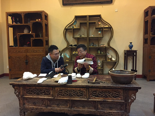 中央臺(tái)記者董浩(左)采訪內(nèi)聯(lián)升國家級傳承人何凱英