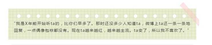 這樣的話你肯定聽(tīng)過(guò)。乍一看沒(méi)什么毛。翰蛔邔こB,我們不一樣。但請(qǐng)問(wèn),咱喜歡的,究竟是音樂(lè)和音樂(lè)人,還是自己卓爾不群的小眾品味?如果只是后者,那就請(qǐng)不要把如今的感情破裂,歸結(jié)到“ta變了”頭上。希望自己喜歡的音樂(lè)人永遠(yuǎn)小眾,永遠(yuǎn)老淚縱橫。這其實(shí)不是真正的喜歡,而是優(yōu)越感和占有欲的合體。如果音樂(lè)人足夠優(yōu)秀,足夠努力,ta為什么就不能紅?為什么就不能靠做音樂(lè)過(guò)上更美好的生活?一輩子都優(yōu)秀、努力又小眾,難道ta靠吸仙氣續(xù)命?