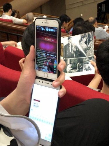 現(xiàn)場有鄭州大學(xué)的學(xué)生戲迷在網(wǎng)絡(luò)視頻直播演出前的現(xiàn)場和謝幕盛況
