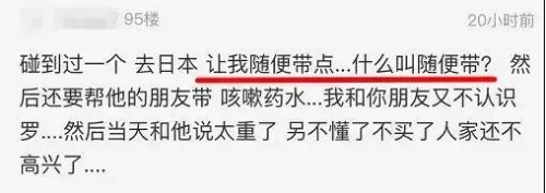 其實(shí)被采訪的人當(dāng)中,一般性質(zhì)的代購(gòu),差不多一半的人是愿意幫忙的,尤其是關(guān)系比較好那種,但是有的時(shí)候如果你這東西太奇葩,或者特別磨人,耽誤行程那就不會(huì)開(kāi)心了。