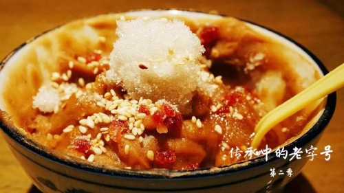 有一年,到北京來上供的外地大臣,給御膳房帶了一種金黃色類似小米的糜子米。當時宮廷里頭還沒見過這種米,我曾祖父李金祥,就把這個米先用水泡了,然后晾干,用手工磨成面粉。用開水一沖,顏色馬上就變成金黃色,這個面馬上就凝固了,然后他就給配上點紅糖,擱了點桂花汁、核桃仁、芝麻仁,在皇宮里頭,他們感覺是相當好。就把這茶湯定為了宮廷早茶,這應該說就是茶湯的由來。