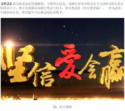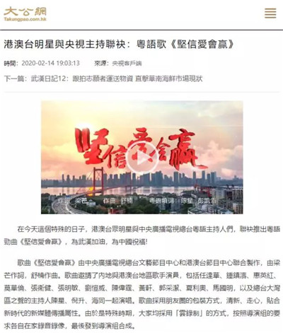 近日,由中央廣播電視總臺制作,中央廣播電視總臺粵語主持人聯(lián)合港澳臺眾明星聯(lián)袂演唱的抗擊疫情歌曲《堅信愛會贏》粵語版在港澳地區(qū)熱播,歌曲引發(fā)港澳民眾熱烈反響,鼓勵人們齊心協(xié)力共同戰(zhàn)勝疫情。