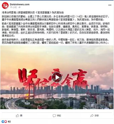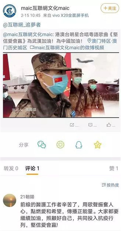 香港市民陳志豪對記者表示,中央廣播電視總臺制作了這首激勵人心的粵語版歌曲,對香港人和澳門人來說特別有親切感!案枨鷤鬟f出齊心協(xié)力、共同抗擊疫情的決心與意志及催人奮進(jìn)的力量。”澳門中華新青年協(xié)會負(fù)責(zé)人林晨看了歌曲的視頻覺得備受鼓舞,他相信中國人經(jīng)過齊心協(xié)力,一定能夠戰(zhàn)勝疫情。網(wǎng)友“21朝陽”在澳門互聯(lián)網(wǎng)文化協(xié)會的社交媒體上留言表示:前線醫(yī)護(hù)工作者辛苦了,用歌聲振奮人心,點燃愛和希望,傳播正能量。大家都要繼續(xù)加油,照顧好自己,共同投入抗疫行列,堅信愛會贏!網(wǎng)友Lusu留言說:眾志成城,武漢加油,中國必勝!
