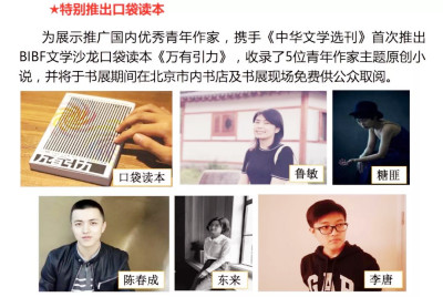 今年,北京國(guó)際圖書博覽會(huì)被納入第七屆北京惠民文化消費(fèi)季活動(dòng),連同國(guó)家大劇院藝術(shù)之旅、北京世園會(huì)大型游園會(huì)等20場(chǎng)大型展會(huì)及30項(xiàng)主題系列活動(dòng),圍繞“悅文化 惠生活”的主題,為市民開展豐富多彩的惠民文化消費(fèi)活動(dòng)。為吸引市民閱讀,圖博會(huì)攜手《中華文學(xué)選刊》首次推出BIBF文學(xué)沙龍口袋讀本《萬有引力》,收錄5位青年作家主題原創(chuàng)小說,在北京市內(nèi)書店及書展現(xiàn)場(chǎng)免費(fèi)供公眾取閱。書展期間,將推出60歲以上老人免票、在市內(nèi)書店免費(fèi)發(fā)放可兌換書展門票的明信片、展商圖書折扣促銷和舉辦上百場(chǎng)大眾閱讀活動(dòng)等一系列惠民舉措,促進(jìn)全民閱讀,切實(shí)讓市民享受到優(yōu)惠。