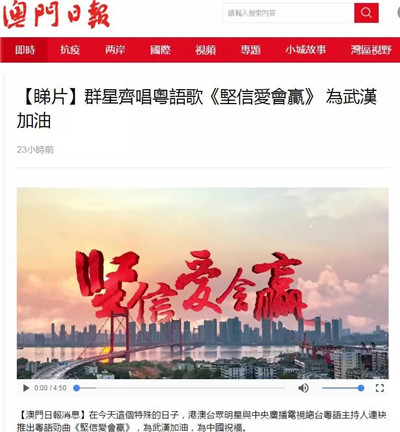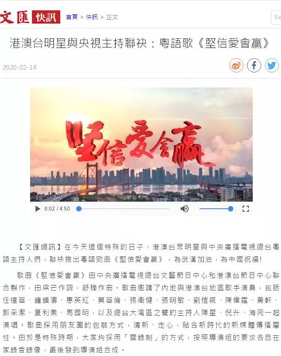 近日,由中央廣播電視總臺制作,中央廣播電視總臺粵語主持人聯(lián)合港澳臺眾明星聯(lián)袂演唱的抗擊疫情歌曲《堅信愛會贏》粵語版在港澳地區(qū)熱播,歌曲引發(fā)港澳民眾熱烈反響,鼓勵人們齊心協(xié)力共同戰(zhàn)勝疫情。