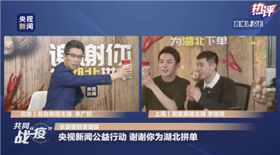 4月6日,首場(chǎng)被網(wǎng)友稱為“小朱配琦”的公益直播由總臺(tái)央視“段子一哥”朱廣權(quán)和“淘寶”平臺(tái)“帶貨一哥”李佳琦通過(guò)“連麥”隔空“云直播”,為湖北小吃和特產(chǎn)帶貨,兩個(gè)小時(shí)的直播吸引了1091萬(wàn)人次觀看,累計(jì)觀看次數(shù)1.22億人次,直播間點(diǎn)贊數(shù)1.6億個(gè),賣(mài)出總價(jià)值4014萬(wàn)元的熱干面、魚(yú)糕、鴨脖等商品,幾乎所有的貨品都在15秒內(nèi)售空。用戶注意力聚集甚至超過(guò)“淘寶”的“雙十一”活動(dòng)。