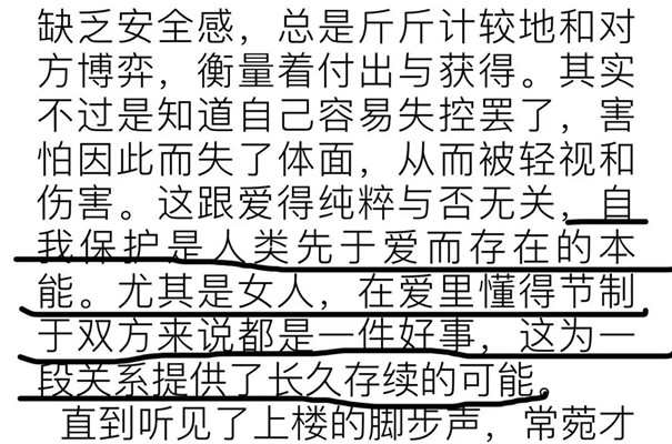 ※ 在感情中越強(qiáng)勢的人越是缺乏安全感,總是斤斤計(jì)較地和對方博弈,衡量著付出與獲得。其實(shí)不過是知道自己容易失控罷了,害怕因此而失了體面,從而被輕視和傷害。