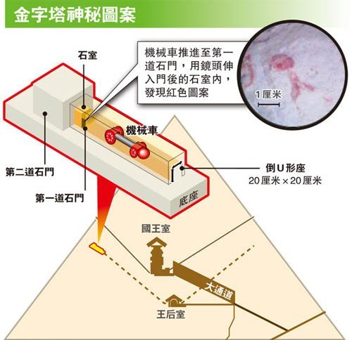 據(jù)香港明報報道,香港牙醫(yī)兼探險家伍士銓與他的團隊,研制出小型機械車,深入埃及胡夫(Khufu)金字塔,穿過從王后密室伸延出去的20厘米乘20厘米窄小秘道,車上可轉(zhuǎn)彎鏡頭,終把4500年來從未曝光的小密室門后的紅色圖案,展現(xiàn)世人面前,而這一道小密室門亦很可能引領(lǐng)至另一隱藏密室。