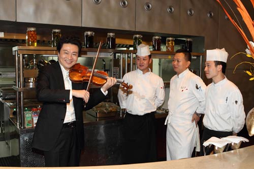 當天,呂思清與大劇院西餐廳廚師長Peter共同烹飪了“馬可?波羅套餐”中的碳烤雞胸混合生菜堅果沙拉。這款沙拉的設計靈感正是來自于國家大劇院原創(chuàng)舞劇《馬可?波羅》,融入了濃郁的意大利風格。小提琴大師呂思清不但親自動手烹制,還向大劇院西餐廳工作人員暢言了對這道菜品的改進意見。呂思清說:“美食與音樂,是我終其一生都不會放棄的兩樣東西,現(xiàn)在,它們在這里,有了某種共鳴,美妙不可方物!