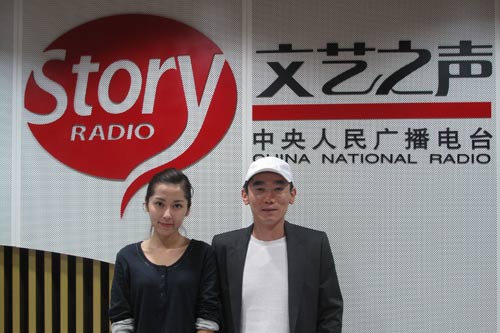 導(dǎo)演馮超(右)和演員陳飛羽(左)在直播間留影(記者呂煒 攝)