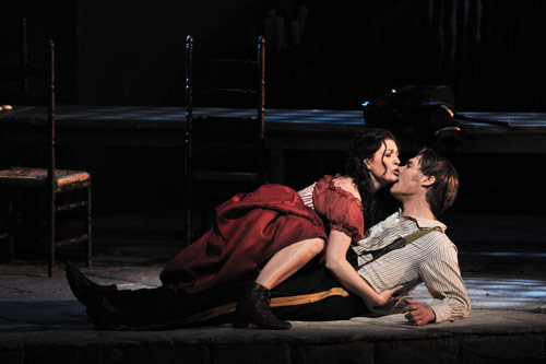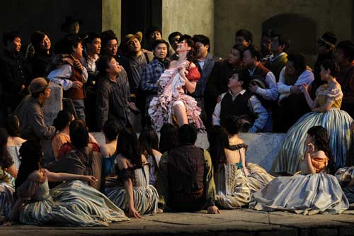 中廣網(wǎng)北京4月11日消息(記者 呂煒)美國紐約大都會“金童玉女”引燃全場熱情。4月10日,卡門的扮演者維克托麗拉·維津和堂·何塞的布蘭登·喬瓦諾維奇,成為演出的大亮點。兩人曾共同出演過大都會歌劇院的《卡門》,當時他們以登對外形、默契表演被評為“金童玉女”。在近日中國國家大劇院的演出中,維津和喬瓦諾維奇繼續(xù)延續(xù)之前的默契,無論是第一幕情意綿綿的對唱,還是最后一幕充滿仇恨的對手戲,顯露二人豐富的合作經(jīng)驗,他們出色的表演和唱功多次引燃全場。