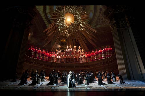 新古典主義的舞臺(tái)設(shè)計(jì)讓新版《托斯卡》從一開(kāi)始就美得“超凡脫俗”,美得典雅、磅礴、精致又大氣,同時(shí)不乏現(xiàn)代與時(shí)尚。特別值得一提的,巨大雄偉的建筑結(jié)構(gòu)呈傾斜呈現(xiàn),好似鏡頭過(guò)濾后扭曲的畫(huà)面。每一幕中,也隨處可見(jiàn)閃耀著強(qiáng)卡洛天才般智慧的處理。第一幕結(jié)尾處,教堂的穹頂徐徐打開(kāi),不斷擴(kuò)大的縫隙像是慢慢睜開(kāi)的“雙眼”,教堂四壁的油畫(huà)竟然出現(xiàn)在了穹頂,電影鏡頭式的視角轉(zhuǎn)換創(chuàng)造了奇異的舞臺(tái)效果。而當(dāng)?shù)谝荒唤K場(chǎng)的宗教場(chǎng)面進(jìn)入高潮時(shí),觀眾原以為畫(huà)面將就此“定格”,未曾想一座冒著裊裊炊煙的香爐又從舞臺(tái)側(cè)面橫空而出,鐘擺似的回蕩搖擺,預(yù)示著劇中人物跌宕起伏的命運(yùn)。