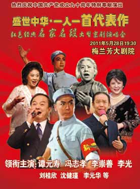 中廣網北京5月4日消息(記者 呂煒)5月28日19點30分,慶祝中國共產黨成立九十周年的特別奉獻《盛世中華·一人一首代表作》紅色經典名家名段大型京劇演唱會,將在北京梅蘭芳大劇院上演;京劇表演藝術家譚元壽、馮志孝、李崇善、李光、沈健瑾、劉桂欣、李元華等登臺演唱,曾在當年家喻戶曉的現代京劇精彩唱段;他們也是廣大觀眾熟悉和喜愛的。