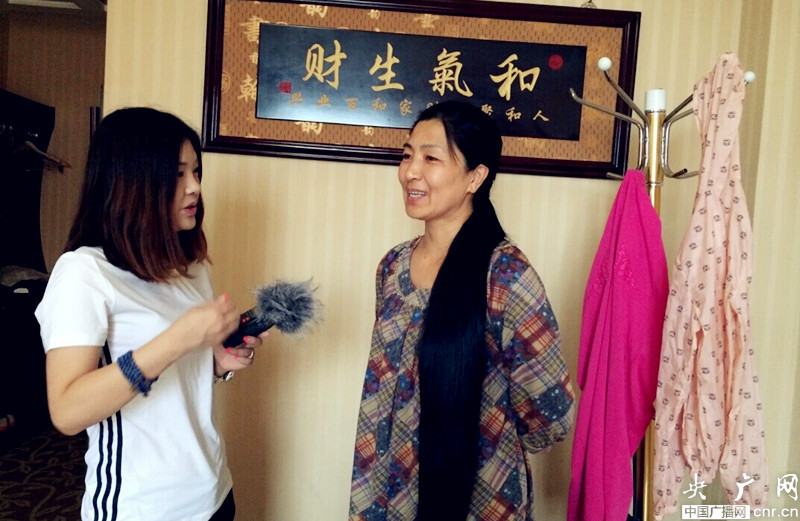 第二天,我們約好時間準備采訪胡嫦娥,胡老師早就開著房門等我們。在門口我們見到了胡嫦娥:她正在梳著長長的頭發(fā),一身簡單的連衣裙,不施粉黛的素顏。見到我們,她馬上微笑著迎上來。簡單的幾句交談,我被這個女人的熱情和親切感染了。