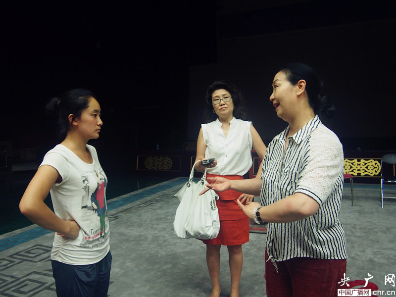 景雪變(右)在給小演員說戲記者姜薇(中)采訪