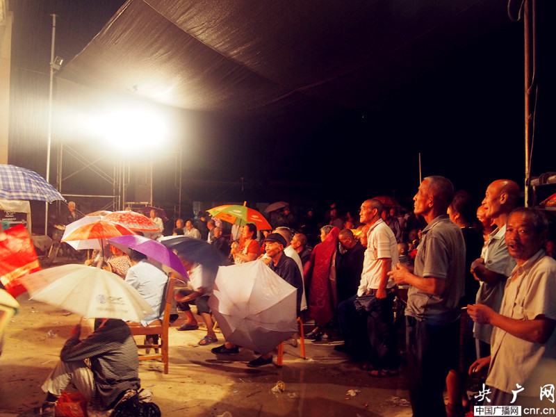 遮雨棚可以擋住一些雨,但破洞處卻時常大股地淌水,因此那下面就沒有觀眾。為了能拍攝到村民如醉如癡看戲地照片,那破洞下,反而成了我的立足地。頭和肩夾住雨傘,采訪機暫放入包里,相機對準觀眾,讓他們對戲曲的癡情記錄在廣播記者的鏡頭下。