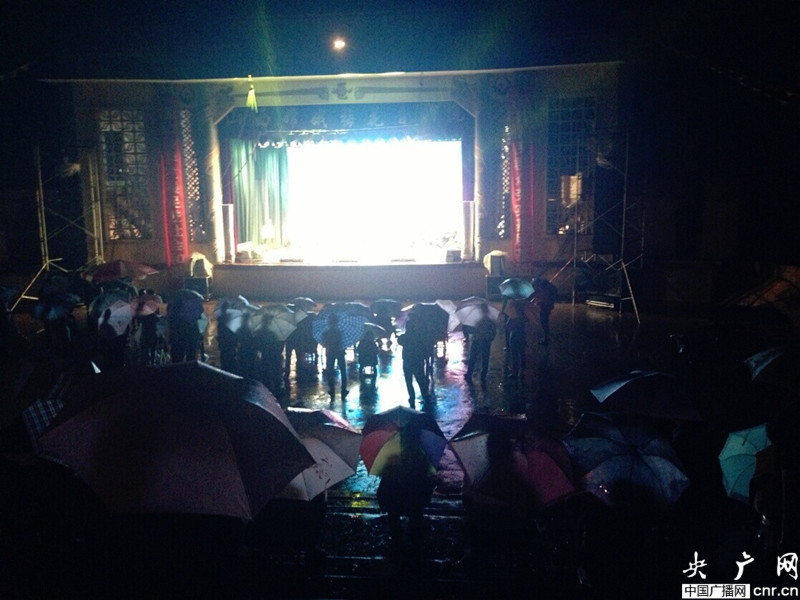 薛家灣這個地方的雨很有個性,說下就下。采訪的最后一天,也是劇團在這里演出的最后一天,小雨一直連綿不斷,我們很擔心今晚的演出能否照常進行。傍晚我們撐著傘,經過泥濘的小路來到了演出的地方。我被眼前的場景給震撼了——密密麻麻的鄉(xiāng)親們早早就搬著小板凳,有的甚至站著,撐著雨傘在臺下等著看戲。胡老師急忙走去化妝間準備,她告訴我們:“只要有一個觀眾就得演”。這是在薛家灣的最后一場演出,胡老師說為了迎合老百姓的需要,他們準備了歌舞表演。