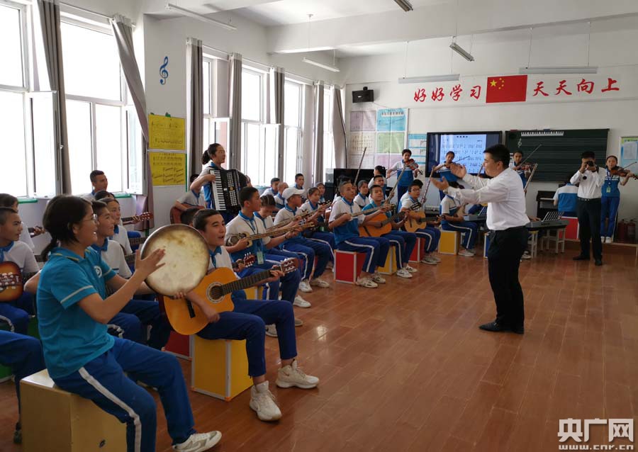走進(jìn)喀什市東城第三初級(jí)中學(xué),同學(xué)們正樂(lè)器合奏,洋溢著歡樂(lè)氛圍。 央廣網(wǎng)記者吳卓勝 攝
