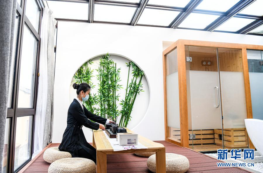 11月26日,在位于烏魯木齊縣的閑來(lái)小鎮(zhèn)閑來(lái)十八院民宿內(nèi),工作人員整理房間物品。