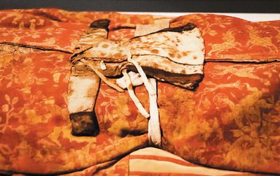 漢晉時(shí)期“營(yíng)盤(pán)男子”服飾(局部),新疆維吾爾自治區(qū)文物考古研究所藏 北京大學(xué)賽克勒考古與藝術(shù)博物館供圖