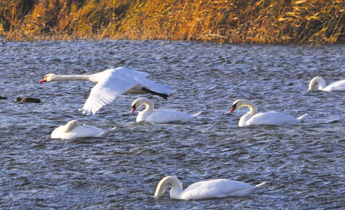 在伊寧縣境內伊犁河谷的天鵝越冬棲息地保護區(qū),一群疣鼻天鵝在嬉戲覓食。
