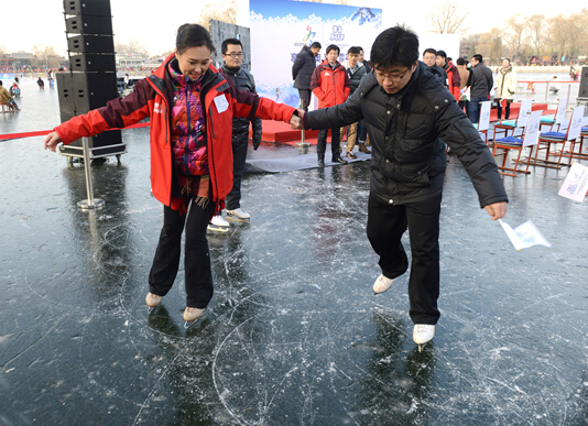 什剎海作為老北京的文化地標,本就游客眾多,此次央.視主持人張斌、冬奧冠軍花樣滑冰運動員陳露親臨現場,冰場上的熱烈氣氛不斷高漲。有的游客與家人一起滑冰車,有的打起了雪仗。其中,能夠與奧運冠軍陳露一起滑冰的市民戚先生無疑是最幸運的。他說,“衷心祝福北京申冬奧成功,一來北京的霧霾可以得到改善,二來冬季健身運動可以更加普及到我們普通人之中。”