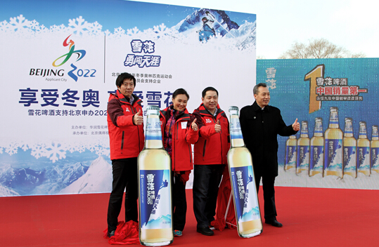 “明年計劃選用60億瓶‘北京申冬奧版’雪花啤酒上市,全面啟動支持北京申冬奧的冰雪運動推廣!2014年12月30日,在冬奧會申辦委員會和冬奧運動員的見證下,雪花啤酒為支持北京申辦2022年冬奧會,在北京什剎海冰場舉行了別開生面的“享受冬奧 享受雪花”發(fā)布會。地面溫度很低,冬季運動熱情卻很高漲,這也許是史上溫差最大的新聞發(fā)布會。