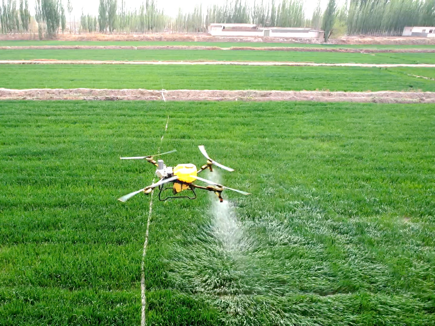 近日,在托普魯克鄉(xiāng)穆孜魯克村的麥田里,滿載藥劑的無人機在專業(yè)操作員的遙控下低空平穩(wěn)飛行,沿著預設航線勻速穿梭,將霧化后的藥液均勻噴灑在麥苗葉片上,實現(xiàn)全田無死角的精準覆蓋。