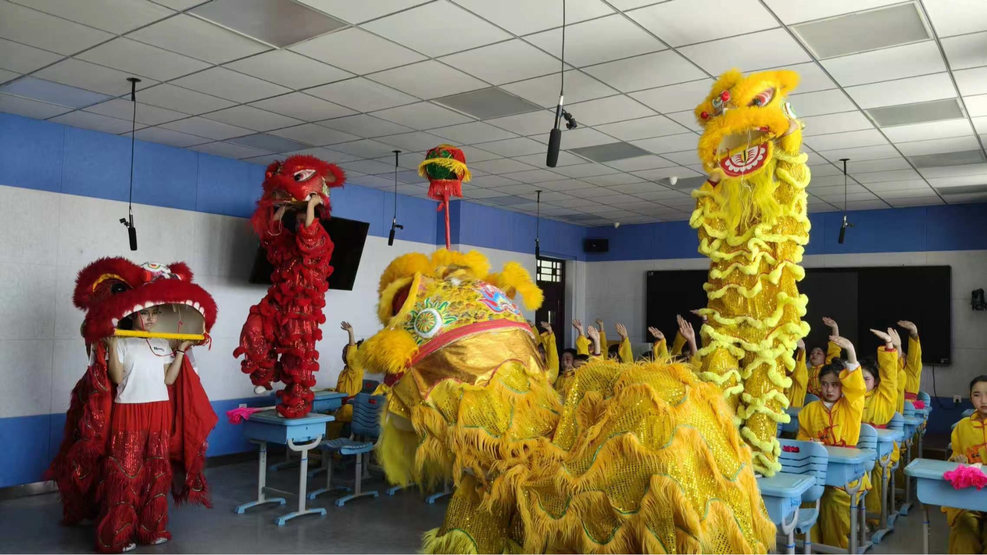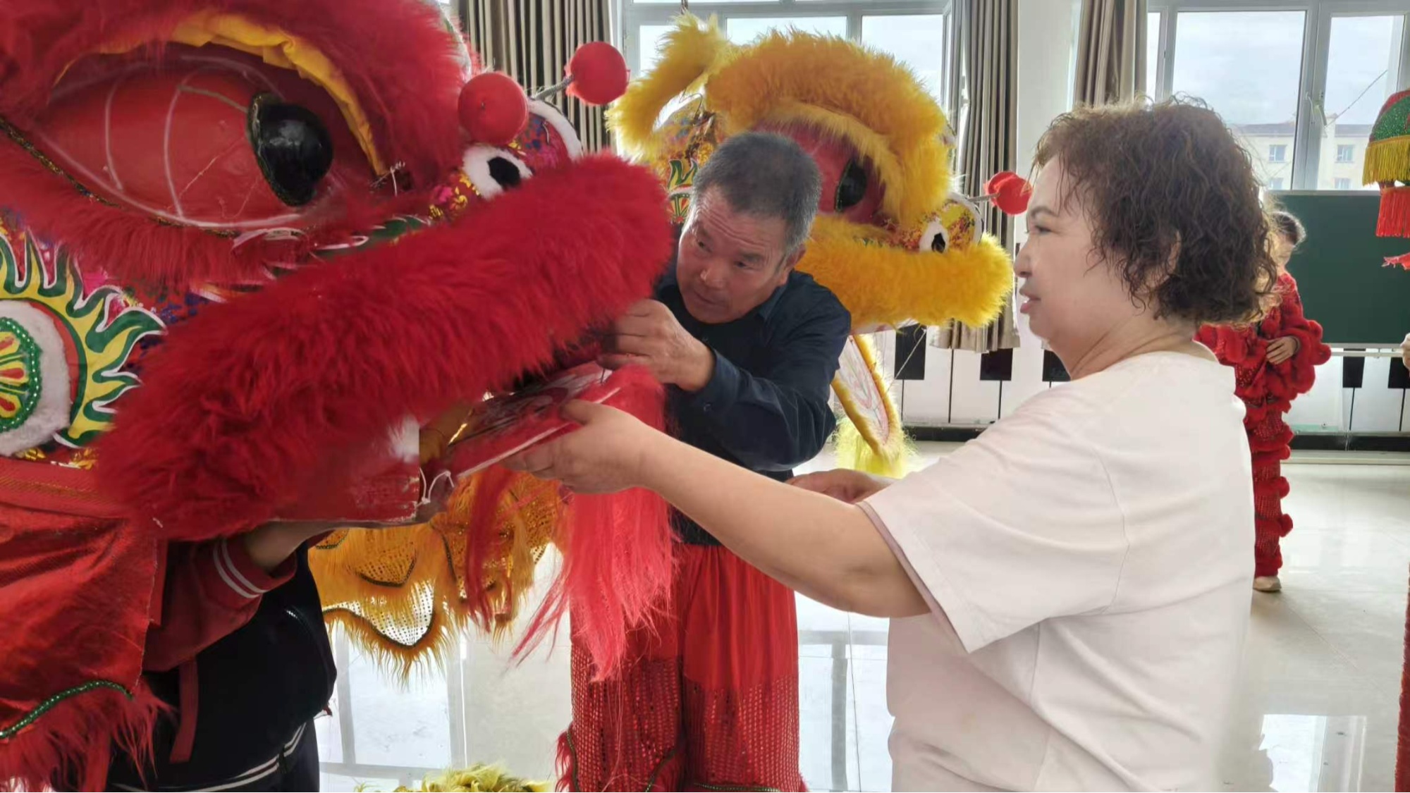 醒獅起勢時頭部緩慢抬起、左右輕點頭,靈動俏皮;輕擺獅尾時腰部帶動尾部左右輕甩,貼合體操舒展節(jié)奏;俯身探看時身體微俯、頭部前探,神態(tài)專注。文化能人逐一分解動作要領,糾正肢體幅度,同步講解動作背后的社火文化寓意,讓孩子們在規(guī)范練習中,既鍛煉體魄,又精準感受舞獅非遺的靈動與厚重,近距離觸摸家鄉(xiāng)文化魅力。
