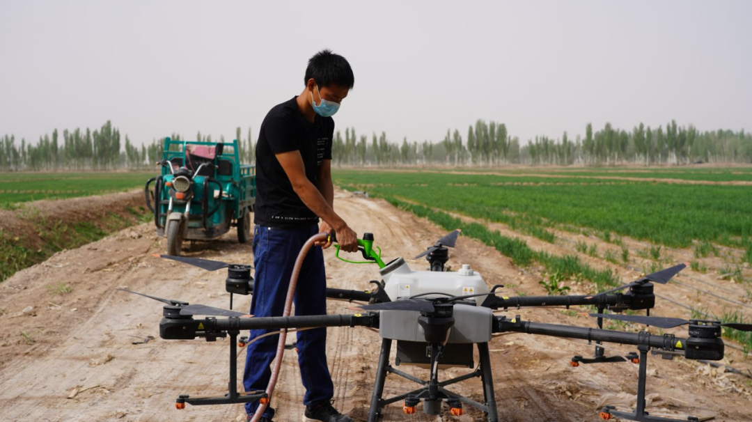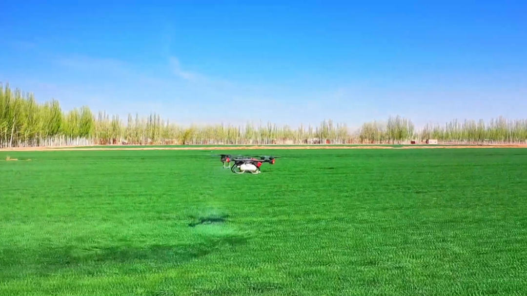 4月14日,蓋孜力克鎮(zhèn)玉斯屯喀什艾日克村的小麥田埂邊,飛手們仔細(xì)配比農(nóng)藥、反復(fù)調(diào)試參數(shù),確保作業(yè)精準(zhǔn)高效。調(diào)試完畢后,無(wú)人機(jī)貼地掠過(guò)麥田,霧化后的藥液均勻?yàn)⒙,精?zhǔn)覆蓋每一株麥苗。僅用2分鐘便完成大片區(qū)域的噴灑作業(yè)。據(jù)了解,單臺(tái)植保無(wú)人機(jī)日均作業(yè)量可達(dá)800畝至1000畝。