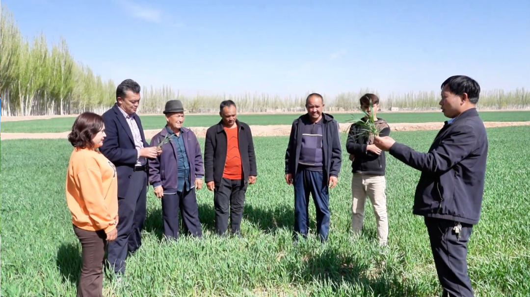 技術(shù)人員正在田間檢查小麥生長(zhǎng)情況 (艾熱提·加沙熱提 攝)
