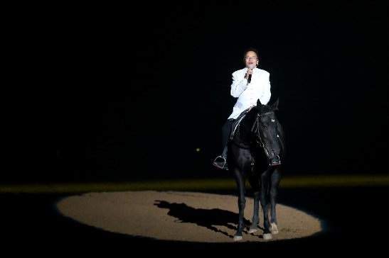 演出接近尾聲,內(nèi)蒙古舞蹈藝術(shù)家、國家一級(jí)舞蹈演員斯仁道力瑪在鼓邊翩翩起舞,伴著極具特色的內(nèi)蒙音樂,她的每一個(gè)動(dòng)作都定格得唯美至極,來自葡萄牙的騎手身騎白馬,款款而來,他騎乘著盧西塔諾馬,單手持韁,另一只手手持馬鞭,馬匹跟隨古典音樂的節(jié)奏變換舞步節(jié)拍,空中換腿,為在場(chǎng)觀眾展示華麗優(yōu)雅的古典馬術(shù)文化。此外,還有內(nèi)蒙千里馬特技隊(duì)策馬奔騰而入,帶來躍馬,撿哈達(dá)等高難度特技表演。